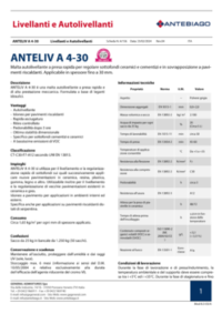 ANTELIV A 4-30 è una malta autolivellante a presa rapida e di alta prestazione meccanica. Conforme alla norma EN 13813 CT-C30-F7-A12. Formulata a base di leganti idraulici, sabbie quarzifere a granulometria controllata ed additivi specifici. Si utilizza per il livellamento di vecchi sottofondi sui quali poter successivamente applicare nuove pavimentazioni in ceramica, resina, plastica, gomma, legno e altro. Specifica anche per applicazioni su pavimenti riscaldanti dotati di serpentina. Applicabile con spessori compresi tra 4 e 30 mm. Consente la pedonabilità dopo 3 ore e la posa delle piastrelle dopo 48/72 ore.