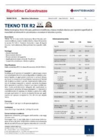 TEKNO TIX R2 è una malta tixotropica, fibrorinforzata, polimero-modificata, a basso modulo elastico. Classe R2 secondo la norma EN 1504-3. Prodotto formulato a base di leganti idraulici, inerti selezionati, fibre polimeriche e specifici additivi. Si utilizza per il ripristino di manufatti in calcestruzzo armato e al consolidamento di murature degradate, in laterizio o materiale lapideo, in applicazioni orizzontali e verticali. Idonea anche per la correzione di imperfezioni, riparazione di limitati nidi di ghiaia su pilastri o pareti, miglioramento della planarità di strutture orizzontali o verticali, aumento localizzato dello spessore di copriferro. Grazie al suo basso modulo elastico risulta particolarmente adeguata alle applicazioni su conglomerati cementizi di basse prestazioni o interventi di consolidamento di murature, in laterizio o pietra. Non utilizzare per applicazioni di natura strutturale. Idoneo per applicazioni con spessori compresi tra 10 e 40 mm per singola mano.