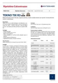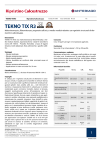 TEKNO TIX R3 è una malta tixotropica, fibrorinforzata, a medio modulo elastico, espansiva all’aria. Classe R3 secondo la normativa EN 1504-3. Formulata a base di leganti idraulici, sabbie quarzifere a granulometria controllata, fibre polimeriche ed additivi specifici che consentono di ridurre il rischio di fessurazione dovuto ai fenomeni di ritiro.