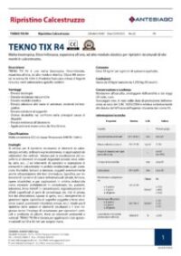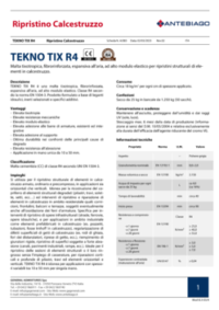 TEKNO TIX R4 è una malta tixotropica, fibrorinforzata, espansiva all’aria, ad alto modulo elastico. Classe R4 secondo la norma EN 1504-3. Prodotto formulato a base di leganti idraulici, inerti selezionati e specifici additivi. Si utilizza per il ripristino strutturale di elementi in calcestruzzo armato, ordinario e precompresso, in applicazioni sia orizzontali che verticali. Idonea per la ricostruzione del copriferro di elementi strutturali degradati ed interventi di ripristino e riparazione di elementi in calcestruzzo in ambito residenziale quali: cornicioni, frontalini, balconi e terrazze, soggetti eventualmente anche all’ossidazione dei ferri d’armatura. Specifica per interventi di ripristino di opere infrastrutturali, e per applicazioni in ambito industriale come elementi prefabbricati in calcestruzzo, regolarizzazione di difetti superficiali di getti di calcestruzzo, riempimento di giunzioni rigide, ripristino di superfici soggette a forte abrasione.